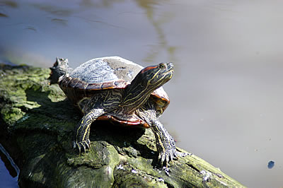 buying the flat off my friend. Blimey – there was this terrapin sunning itself on a log near the bank of the canal. Do I mean a terrapin? I think so. We used to have a few terrapin in the garden when I was a kid. Small things, with shells about the size of the saucer of an elegant coffee cup. Not this one. Breakfast bowl-sized shell! Big bugger. I thought it might be a model which someone had mounted there. You do get that sort of thing on The Cut occasionally, some looking very good. I stopped FRILFORD, backed up a little and took pictures with my zoom lens. Was it a model? It moved its head. It definitely wasn’t a model! It was a magnificent specimen of a terrapin and by far the biggest one I have ever seen. Stay low, mate. Someone will have you, given half a chance… I