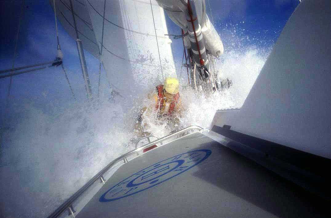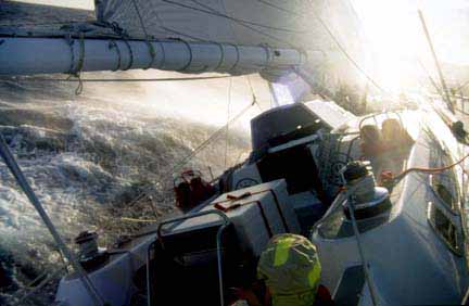 them about a bit to warm them up...! More Anglo-Saxon. In time, from astern, a pale smudge breaks the monotony of black. The night is past. Within an hour a blanket of monochrome flatness reveals the steely grey of the sky sitting uneasily on the crumpled, broken, granite grey of the sea. Below there is movement. The other watch is up once again, stumbling from bunks and into the galley for breakfast. Soon they will be up on deck, blinking and cursing. There'll be the usual litany 'I haven't slept a bloody wink - shit what a miserable day.' Then to no-one in particular 'Oh, still nine knots then - at least we're getting on with it.' You: 'See yuh, have fun...' They: 'Fat chance - see yuh..' At sea you don't spend time with the other watch. You are finished for now; they've got the boat. For you there is breakfast, then into your bunk for more half-sleep. If you are determined, and can get into the heads easily, you might make yourself clean your teeth. It has, after all, been a week since you last did 'em... You might go completely mad and change your underwear - that's been God knows how long.... or you might say 'Sod it' and crawl straight into your sleeping bag. Fate will determine... The boat bashes on powerfully. We are racing around the world. It's taxing, tiring, frustrating, exhilarating, painful and bloody marvellous. Don't make sense of it; just live it....